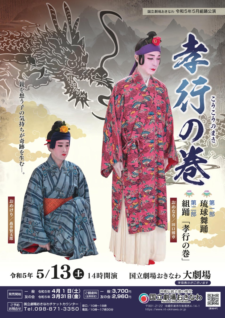 組踊「孝行の巻」は、沖縄県中頭郡嘉手納町に伝わる「屋良漏池(やらむるち)の伝説」に由来しており、大蛇の登場や観音の降臨など他の組踊では見られない仕掛けも見どころです。今回は、立方指導に宮城能鳳氏、地謡指導に城間德太郎氏を迎え、人間国宝両雄による技芸の継承をお届けします。
