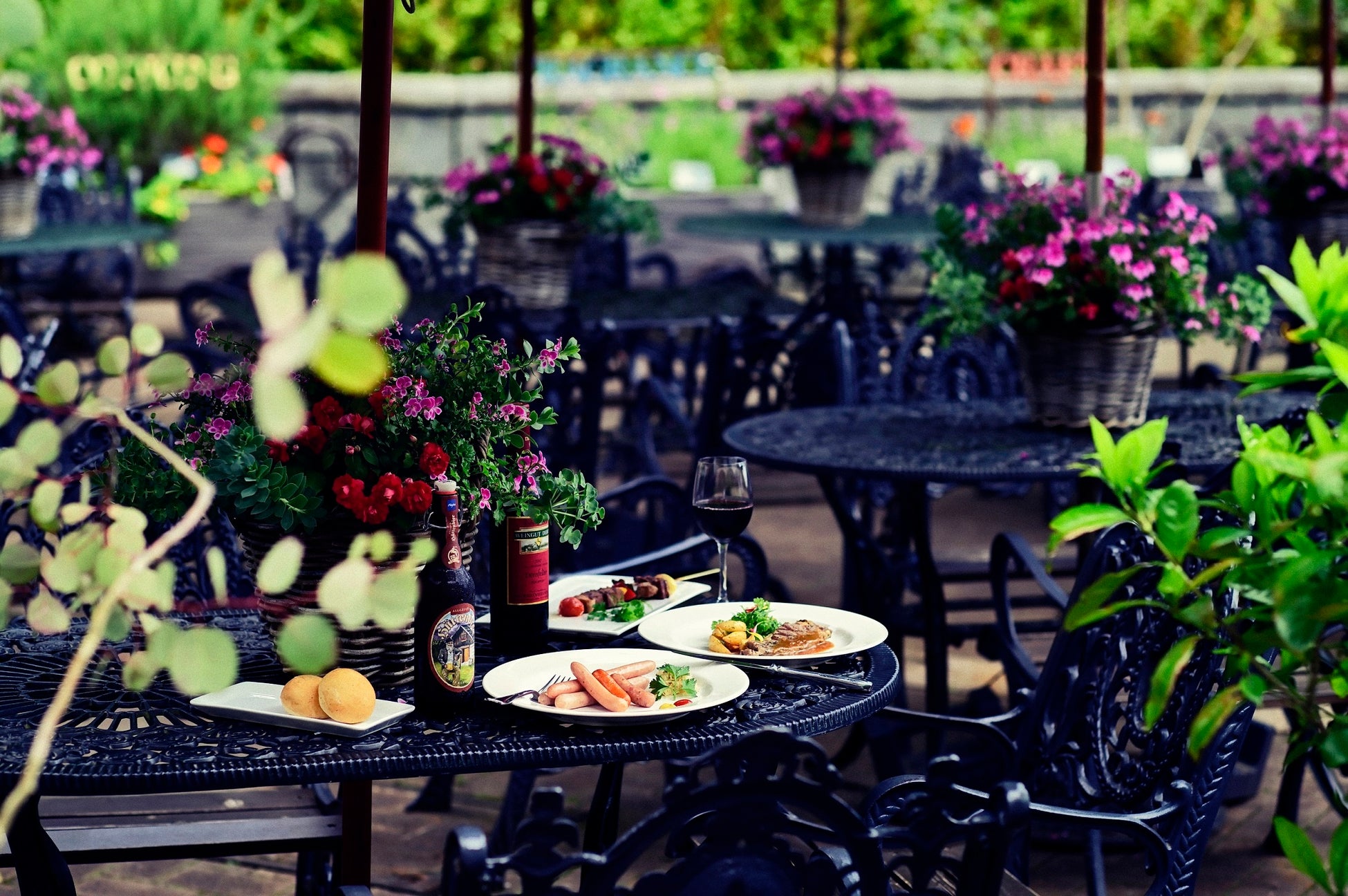 ハーブ園オリジナルのソーセージ盛り合わせや、ステーキ、ビールやワインとの相性抜群の「仔羊のブロシェット」などをご用意しています。こだわりのドイツワインを片手に、大自然の中で日常からふと離れるひと時をお過ごしいただけます。