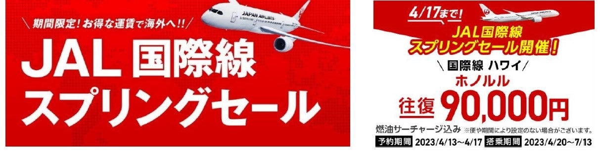 JALは、海外旅行需要喚起を目的に、「JAL国際線スプリングセール」としてお得なセール運賃を4月13日(木)から 4月17日(月)まで期間限定で販売します。ぜひ、この機会にJAL便にて、海外旅行をお楽しみください。