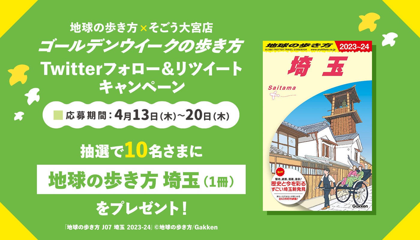 会期中、「そごう大宮店」と「地球の歩き方」の公式Twitterを2アカウントフォローし、そごう大宮店から配信される対象ツイートをリツイートしていただいた方の中から、抽選で10名さまに『書籍/地球の歩き方 埼玉「地球の歩き方 J07 埼玉 2023-24」©地球の歩き方/Gakken』をプレゼントいたします。