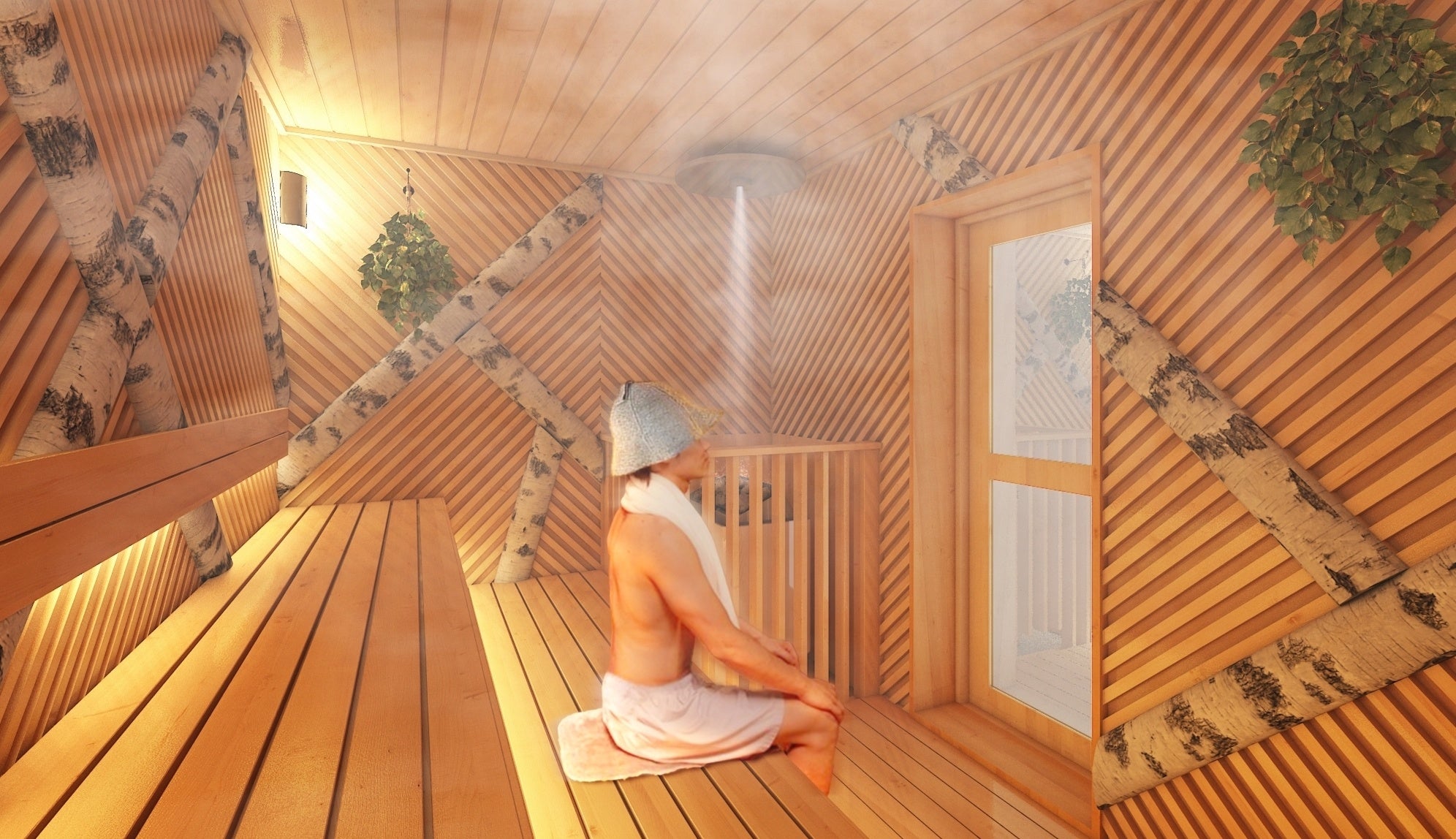 「湖畔混浴 空」は水着着用でご利用いただけるエリア。このエリアには3段ベンチで12名収容可能な男女混合サウナをご用意しました。大浴場全体の中でも中2階のような高さに位置し、サウナ室内から車山・白樺湖を望みつつととのえる、展望サウナです。湖に向けてせり出した大きな窓が立体的に設置され、湖に浮かんだような景色をお楽しみいただけます。