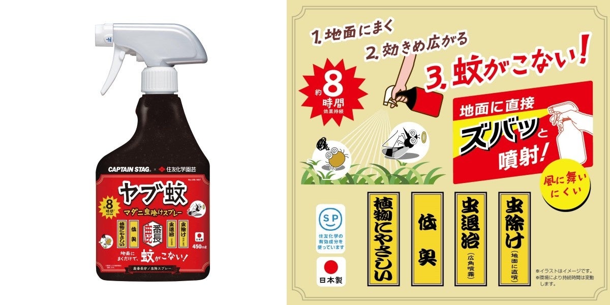 アウトドア用品総合メーカー・キャプテンスタッグ株式会社(本社:新潟県三条市、代表:髙波 文雄)は、住友化学園芸株式会社(本社:東京都中央区、代表:梅田 公利)と協業し、①アウトドアに適した、ヤブ蚊への忌避効果抜群の「蚊取線香」と、②地面に直接噴霧することで忌避効果が得られる「虫除スプレー」を発売いたします。