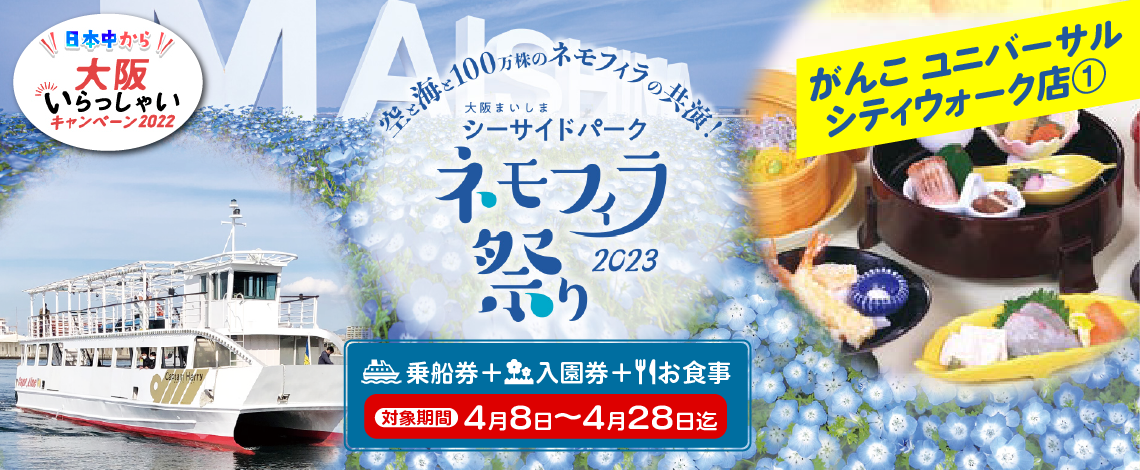 新規レストラン追加【4/28出発限定】大阪出発《全国旅行支援》《舞洲ネモフィラ祭り入場券付》往復舞洲シャトルクルーズ+「がんこユニバーサルシティウォーク店」選べるランチ付き日帰りプラン
