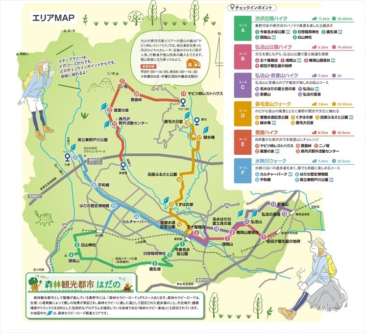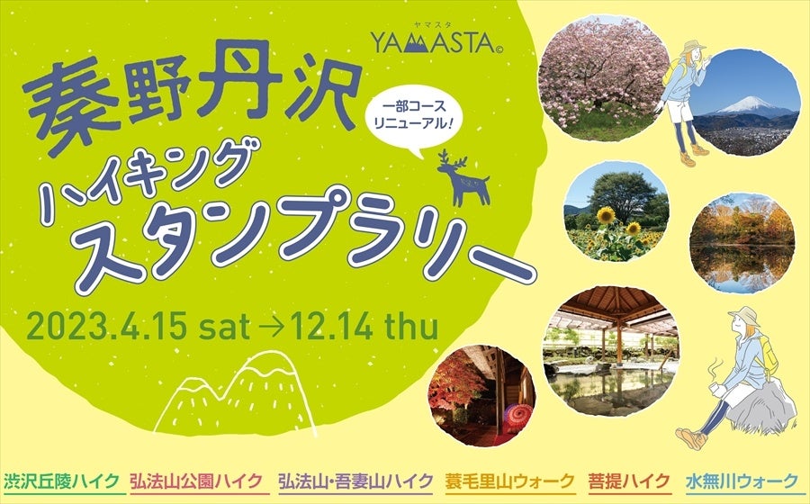 スタンプラリーのコースは、秦野の歴史を感じる気軽なウォーキングから本格登山まで、テーマ別に全6コース。今年は関東の代表的な低山のひとつ「弘法山」を巡るコースがリニューアルされ、さらには、本格的な日帰り登山で人気の表丹沢の山「二ノ塔」がチェックインポイントに追加されました。好評のウォーキングコースは、コース内容はそのままに、一部のスタンプがリニューアルされ、過去に参加いただいた方も気分を新たにお楽しみいただけます。