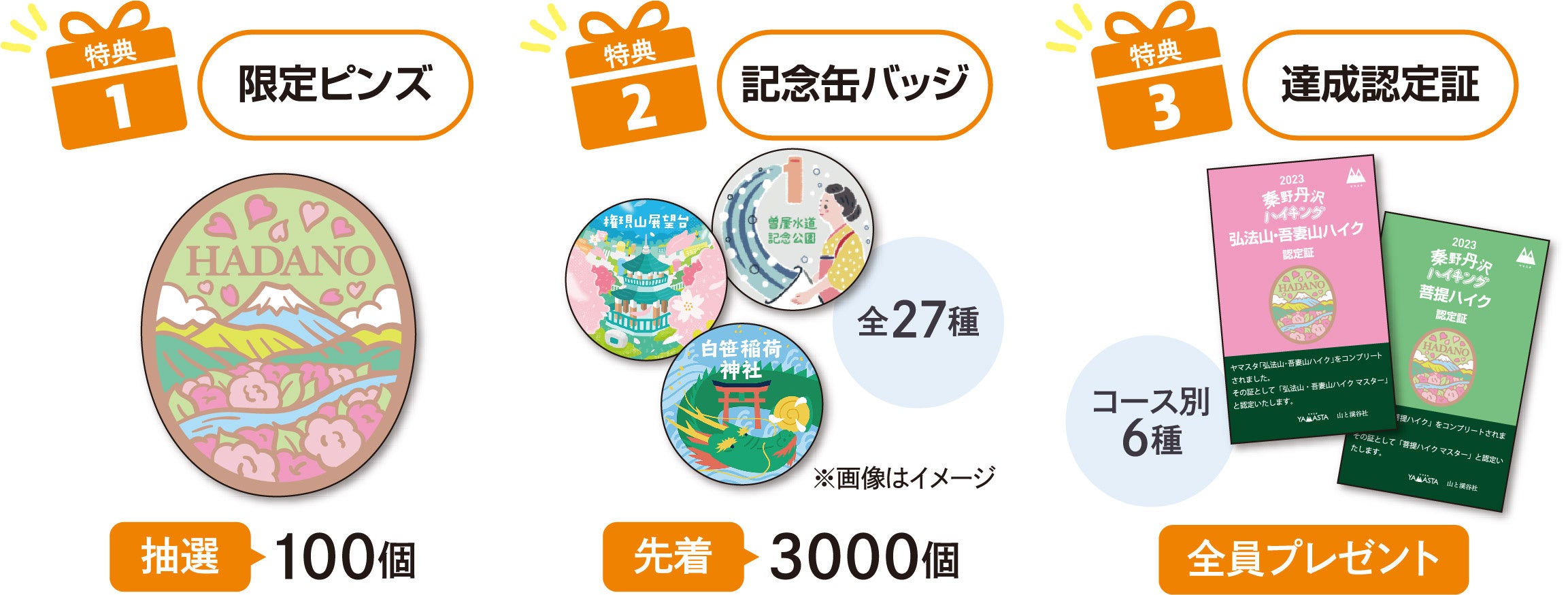 スタンプラリーコースを達成すると、記念缶バッジ(先着3,000個限定、27種)と達成認定証がもらえるほか、山のお土産ブランド「Yamasanka(ヤマサンカ)」とコラボした、人気の特製ピンズ(100個抽選)に応募することができます。