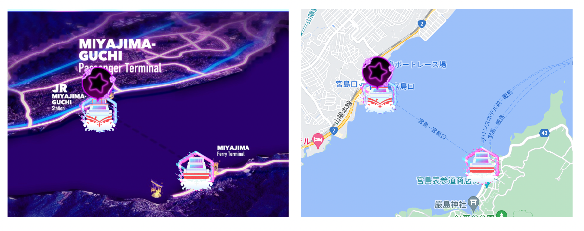 Strolyはデザイン性のあるイラストマップを位置情報(GPS)と合わせてオンラインで表示できる独自の技術を持ち、今回、オリジナルマップの企画、ロケーション技術、スタンプラリー機能、宮島のフェリーの位置情報のリアルタイムで配信機能などを提供しました。