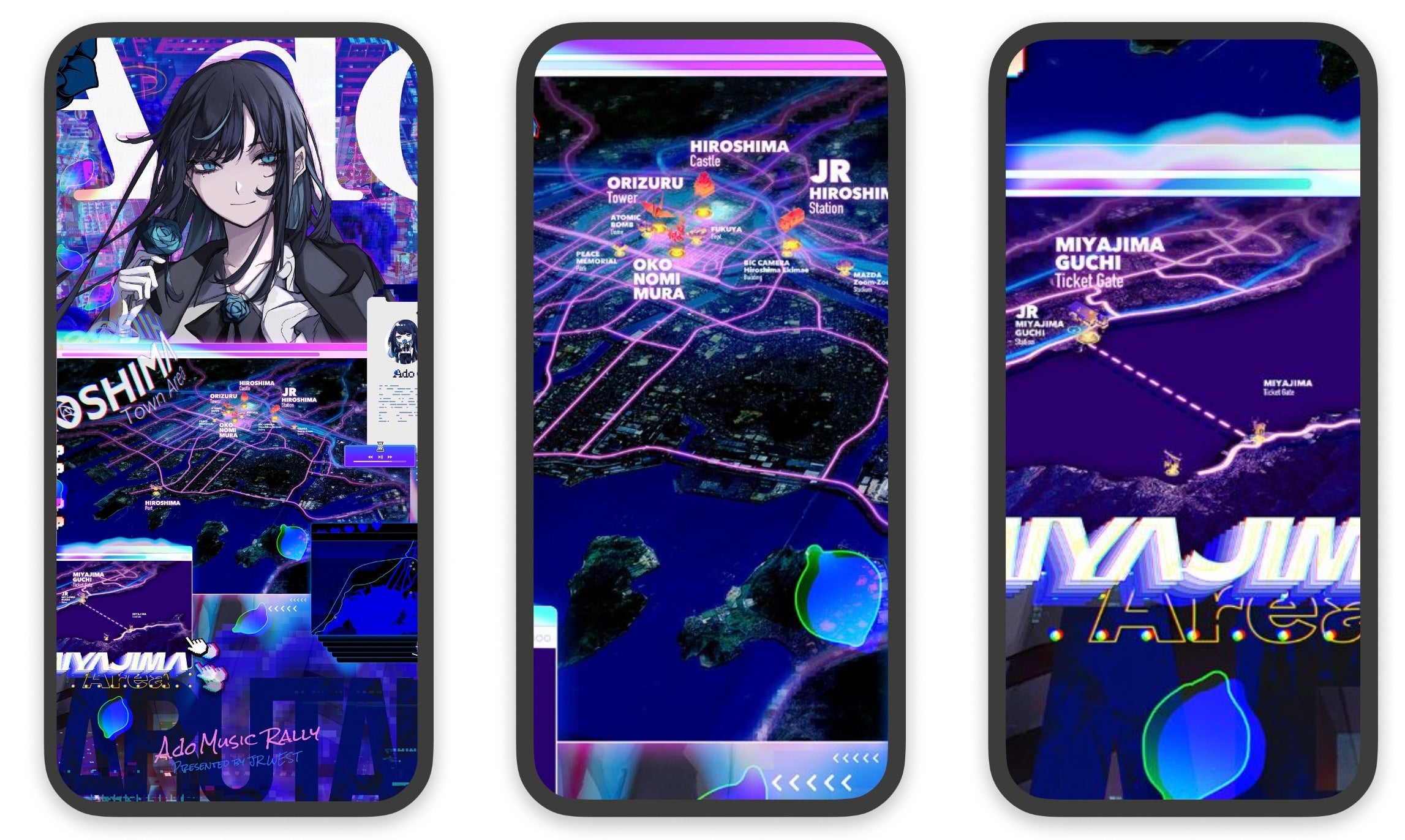 大人気のアーティストAdoさんと、JR西日本が持つZ世代向けの情報プラットフォーム「アオタビ」のコラボレーションで生まれた、広島・宮島が舞台の新しい旅行企画のデジタルコンテンツへStrolyのデジタルマップ及びスタンプラリー機能提供を行い、新機能である「リアルタイムGPSトラッキング表示機能」も実装致しました。