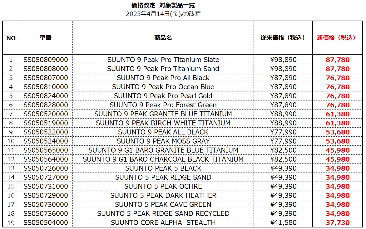 4月14日(金)よりお客様に、よりお求め安い価格で提供することで、スポーツやアウトドアを楽しんでいただける機会を与えたいというスントブランドの戦略の一つとして、下記の通り価格改定致します。