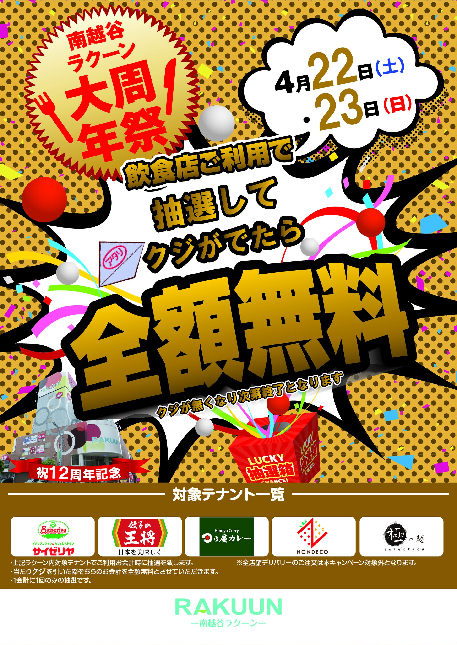 昨年開催し大好評に終わりました。南越谷ラクーン11周年「クジであたりが出たら全額無料‼」イベントを今年も開催いたします。