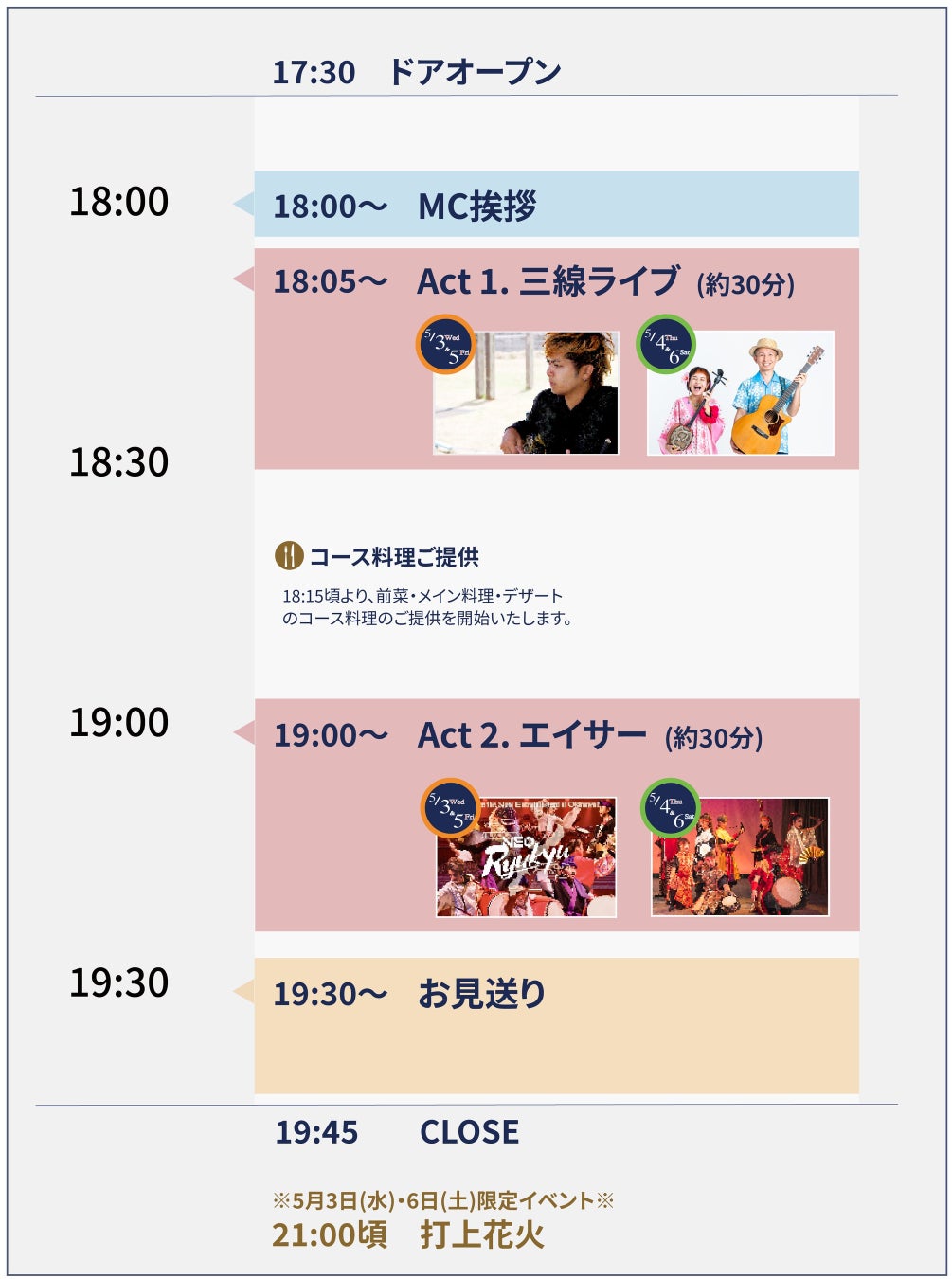 また、3日(水)、6日(土)には沖縄の夜空を彩るGWスペシャル花火も打ち上げ予定となっております。