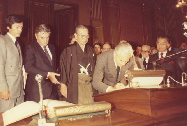 福岡市とボルドー市の交流の歴史は長く、1977年にまでさかのぼります。この年に当時の九州日仏学館館長から両市縁組の話が持ち込まれました。その後、民間団体のボルドー訪問、児童画展や写真展の開催、九州大学とボルドー大学の姉妹提携など、市民レベルの交流を積み重ねが実り、1982年11月に姉妹都市締結に至りました。