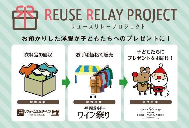 家庭から出る服の廃棄削減を目的としたSDGs活動として、使っていないお洋服をリフォーム三光サービス全店で回収し、リユース品として販売、その売上の一部を福岡クリスマスマーケットが子供施設にプレゼントをお届けする「リユースリレープロジェクト」を実施しています。