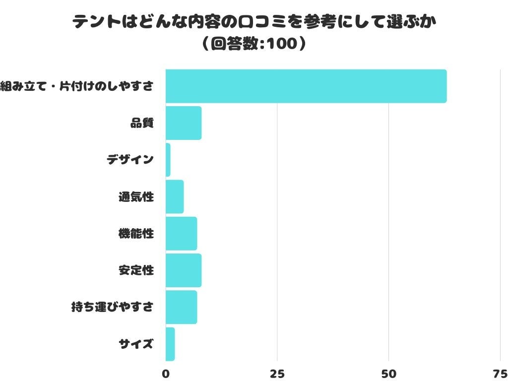 テントのどんな内容の口コミを参考にするかをアンケートにて調査したところ、1位は「組み立て・片付けのしやすさ」 でした。