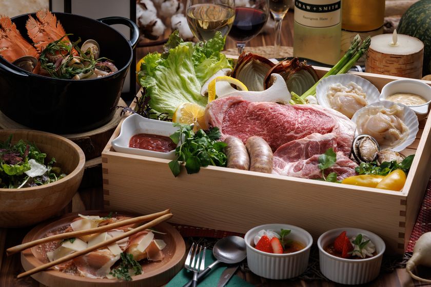 全室に設けられているアウトドアダイニングスペースでは、イタリアンスタイルのバーベキューをお楽しみいただけます。長崎の食材に拘った、海の幸やステーキ材料や道具など快適に過ごしていただく為にすべてご準備いたします。