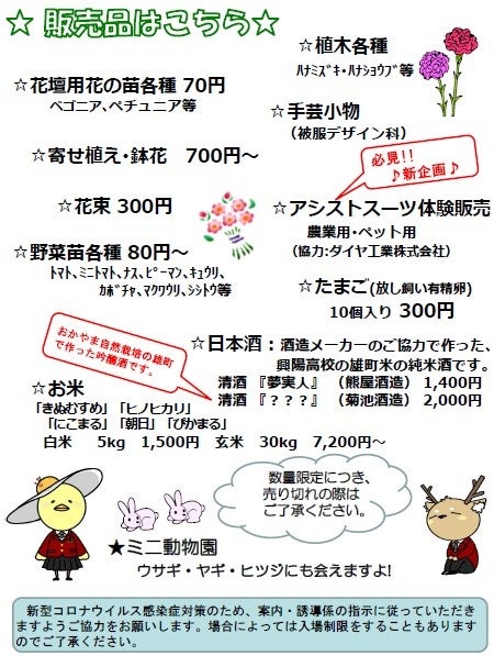 ・販売品:花壇用花の苗各種、野菜苗各種、アシストスーツ体験販売、たまご(放し飼い有精卵)、お米など