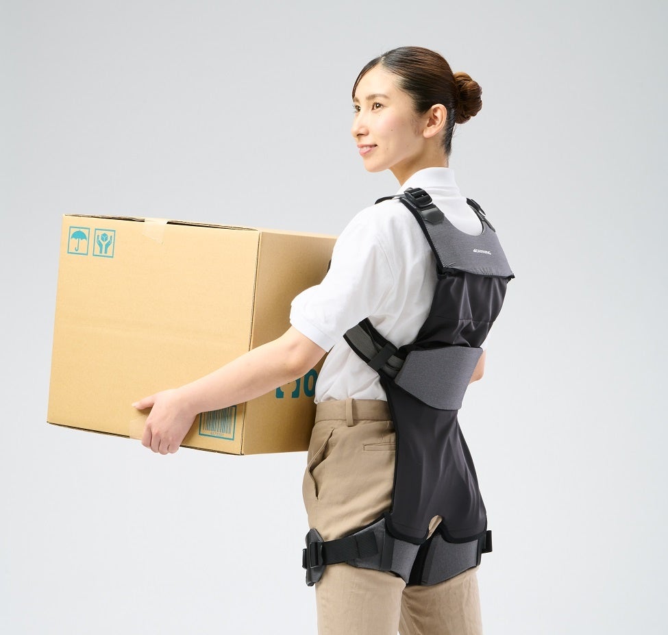 衣服のようなアシストスーツで、肩から腰と脇から腰にかけて特殊高反発ゴムを、腰から大腿部にかけて特殊高反発ゴムと人工筋肉を配置しています。中腰姿勢を維持するときに使う背面の筋肉をサポートし、長時間中腰姿勢で作業する場合などに長時間の姿勢保持がラクになるよう設計されています。