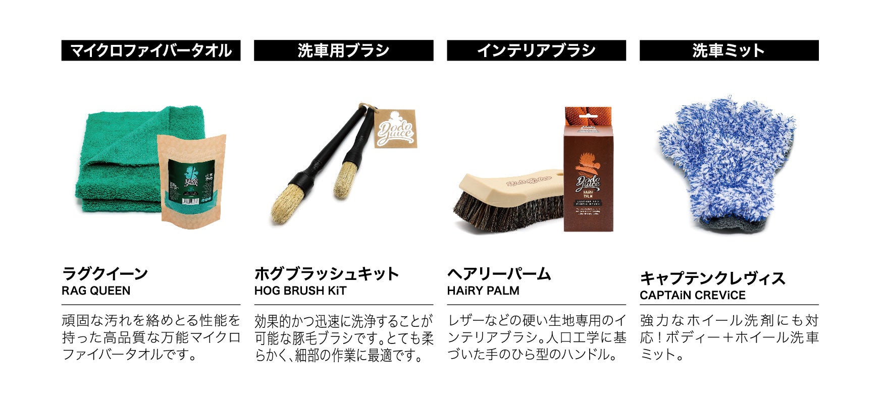 ドードージュース製品は洗車を行う際に必要なカーシャンプーを基本に、下地処理剤(コーティングを行う前に車のボディを平滑にするための溶剤)、コーティング剤、タオル用品とカーケア用品全般をラインナップとして取り揃えております。