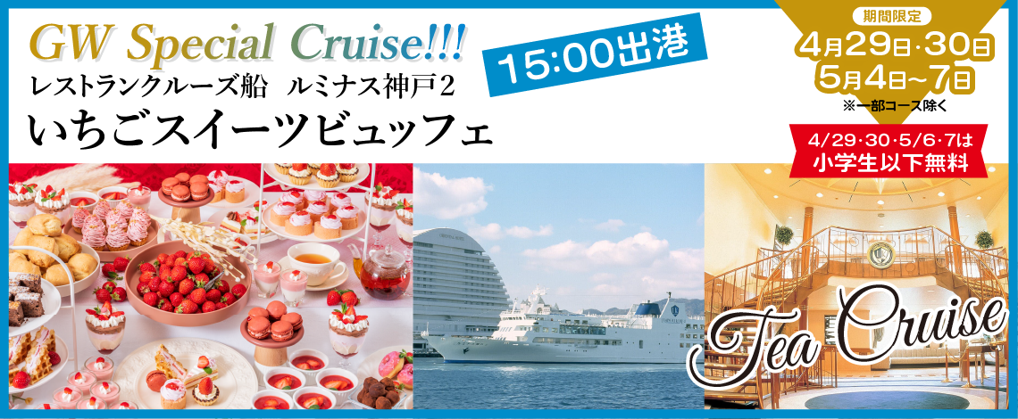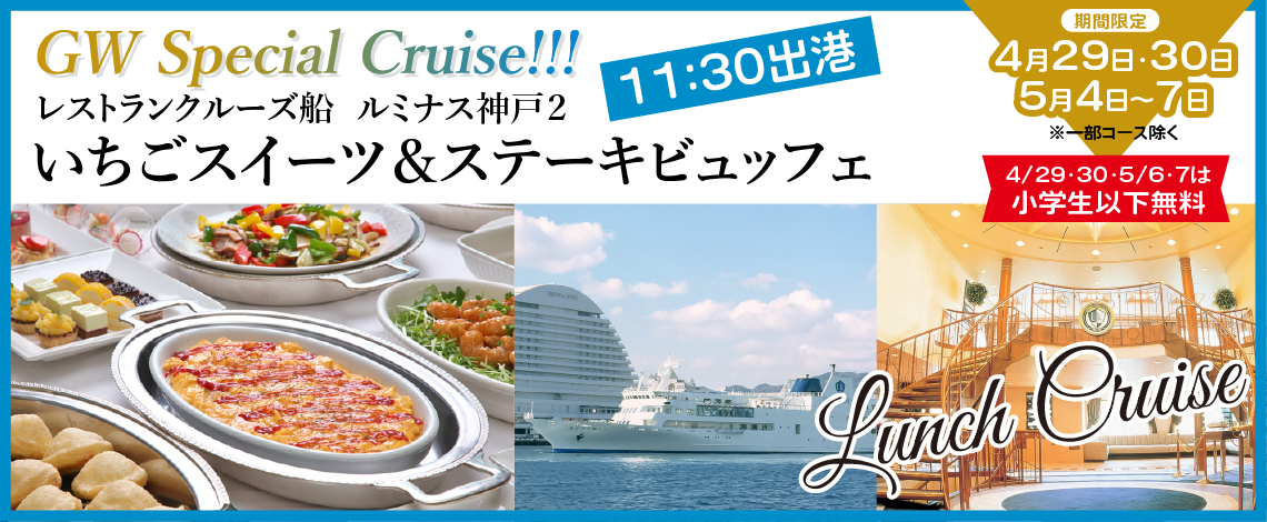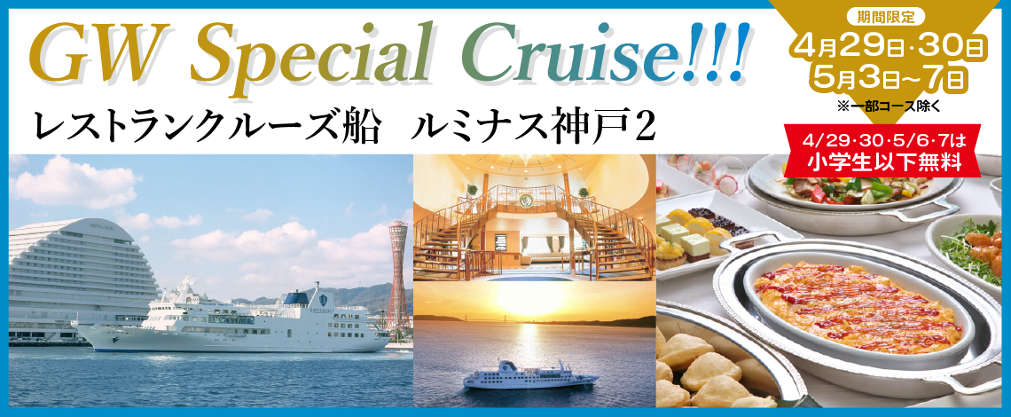 【4/29・30・5/3・4・5・6・7の期間限定プラン】「GW Special Cruise !!!」レストランクルーズ船 ルミナス神戸2 ゴールデンウィークは家族でお食事しながら神戸クルーズを!
