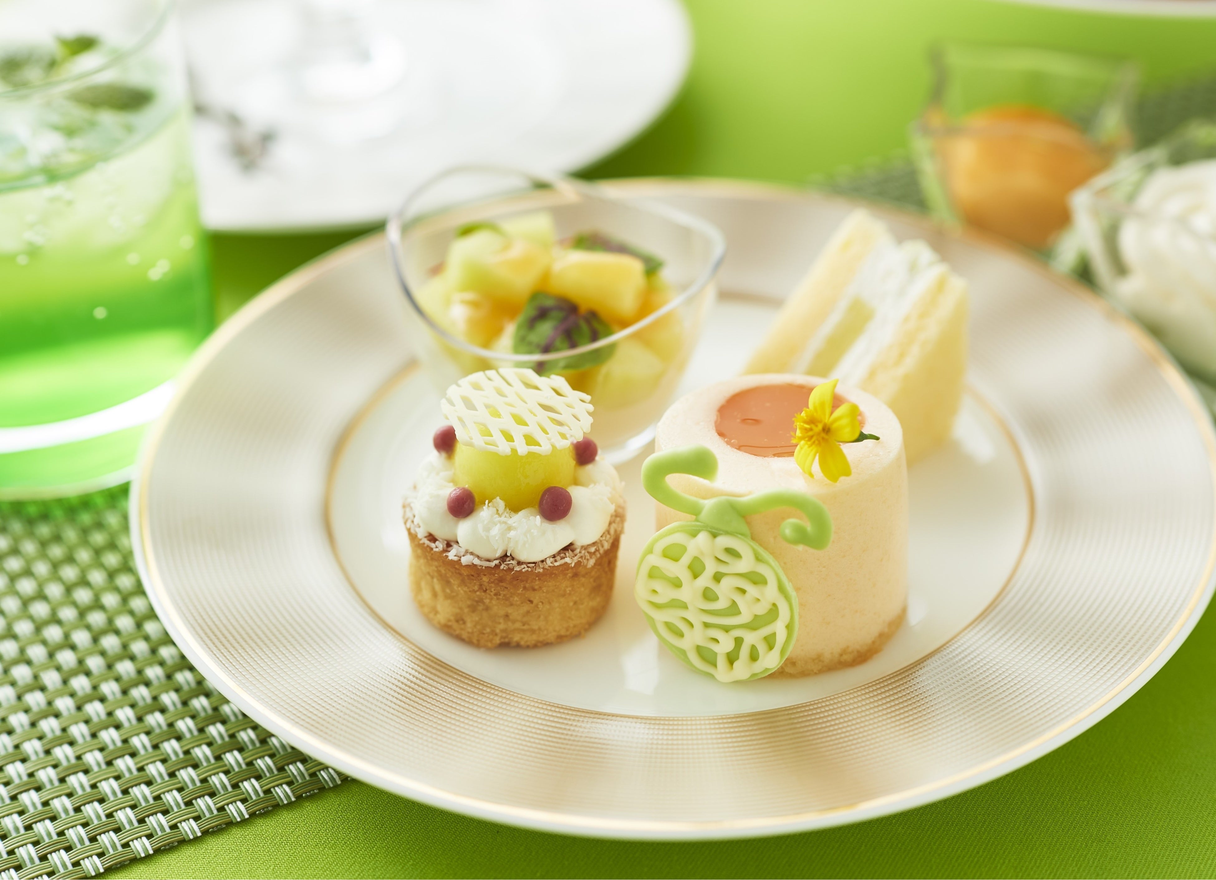 アフタヌーンティーには、メロン尽くしのムースやタルト、ショートケーキなどに加え、ホテル日航大阪アフタヌーンティー定番のミニパフェもご用意。美しく層をなすチーズムースやココナッツのジュレなどがメロンと相性良く重なり、爽やかな甘みが広がるパフェです。