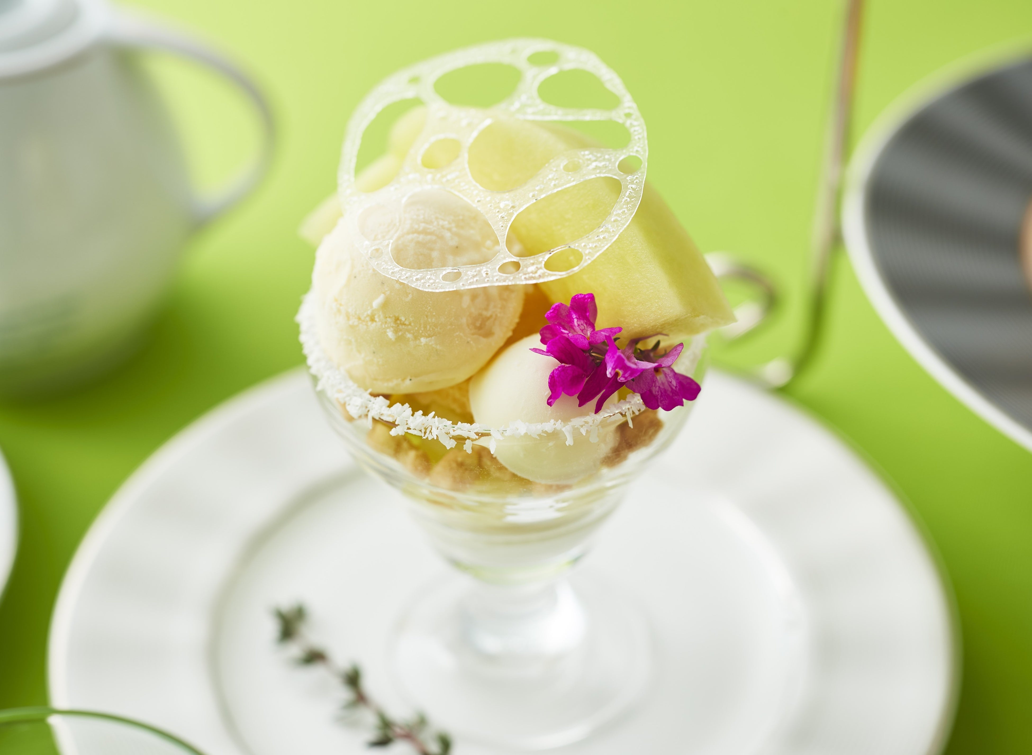 ココナッツのジュレやフレッシュメロン、クランブルなどが層をなしたグラスの上には、フレッシュメロン、バニラアイス、チーズムース、アメ細工をトッピング。見た目も味わいも爽やかなミニパフェ。