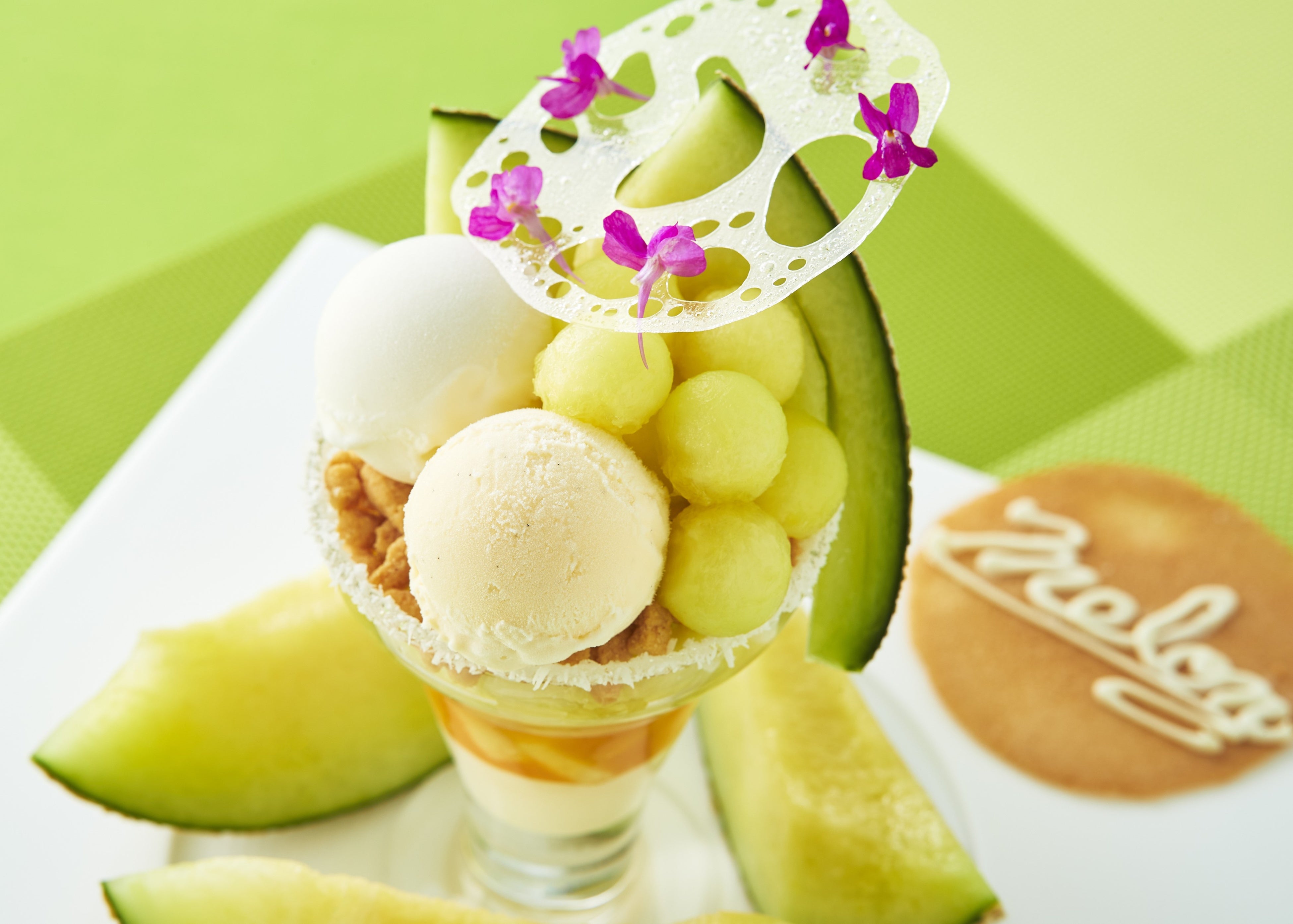 内 容:メロン半玉分を使ったパフェ。パンナコッタ、メロンソース、フレッシュメロン、スポンジ生地などの層の上に、バニラアイス、ココナッツアイス、丸くくり抜いたメロンをかわいくトッピング。仕上げにアメ細工を飾り、グラスの周りにもたっぷりのフレッシュメロンを贅沢に盛り付けました。
