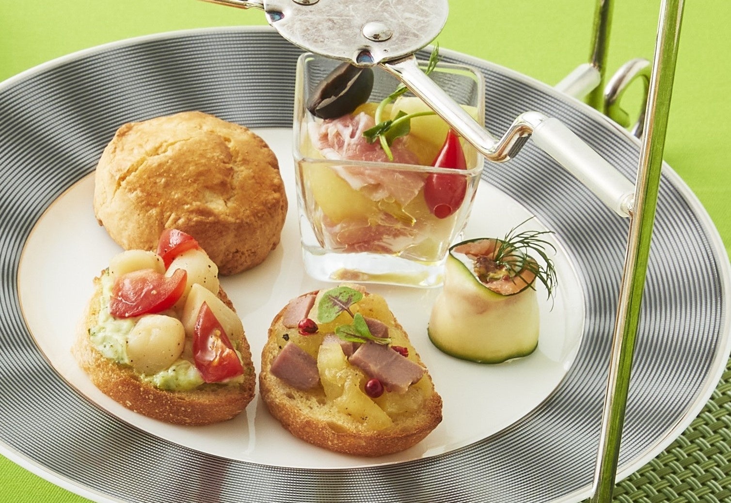 セイヴォリーにも、王道の生ハムメロンをはじめ、鴨とメロンのブルスケッタなど工夫を凝らした品々を取り揃え、満足感たっぷりのアフタヌーンティーに仕上げています。メロンシロップをレモンジュースなどと割ったバーテンダー考案のオリジナルドリンクもお楽しみいただけます。