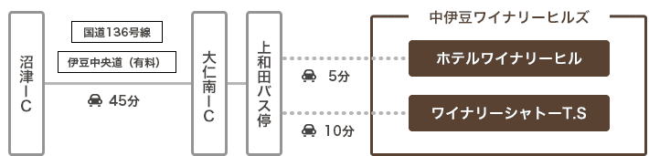 JR 三島駅から伊豆箱根鉄道で修善寺駅まで30分。修善寺駅からホテルワイナリーヒルへはタクシーで10分。中伊豆ワイナリーシャトーT.S、中伊豆EAST WINDS VILLAGEへはタクシーで15分。