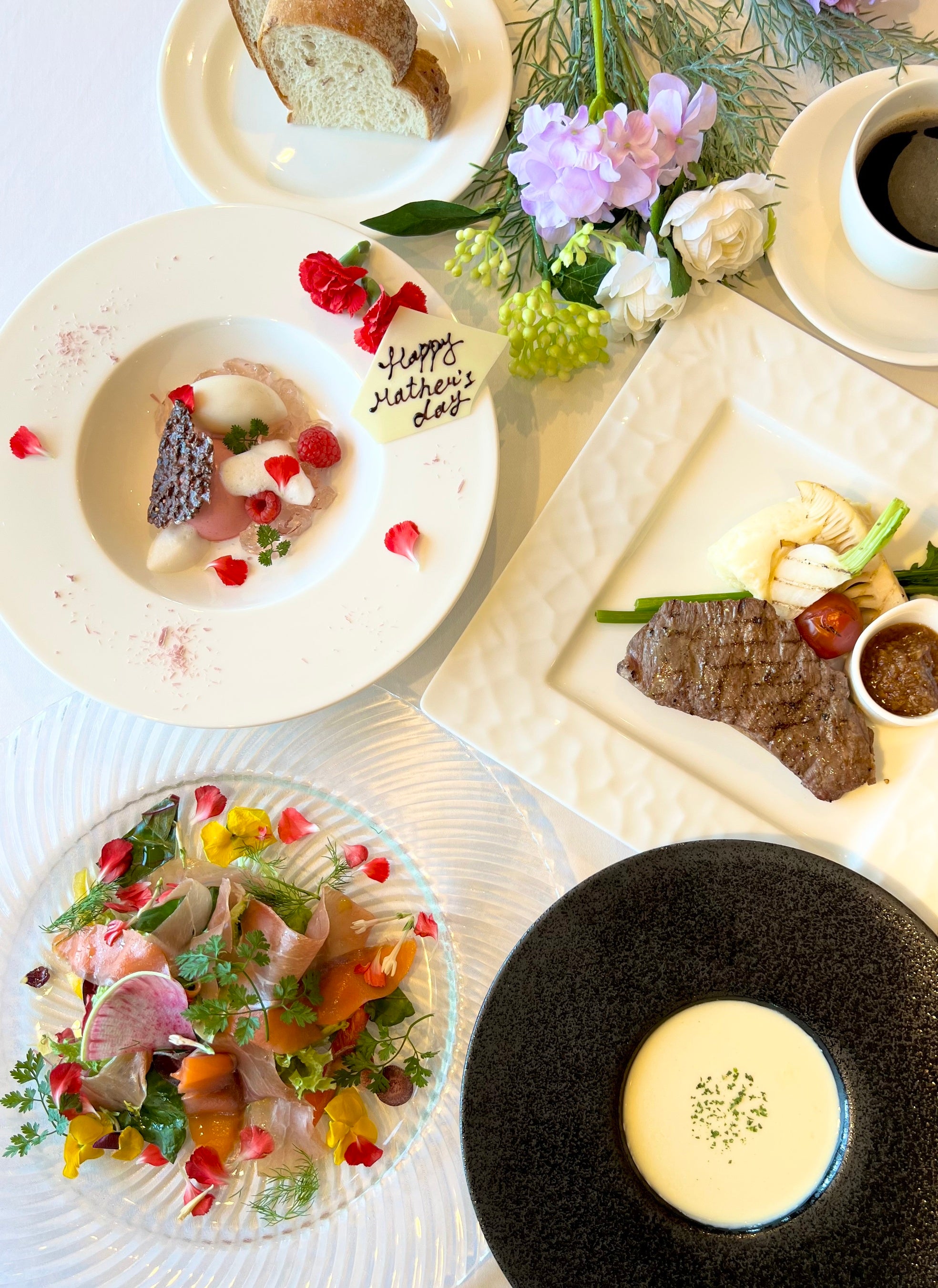 ◆メニュー:本日のサラダ前菜、本日のスープ、パン、サーロインのグリル、フランボワーズのムースとライチのソルベ ~バラの香りを添えて~、コーヒー