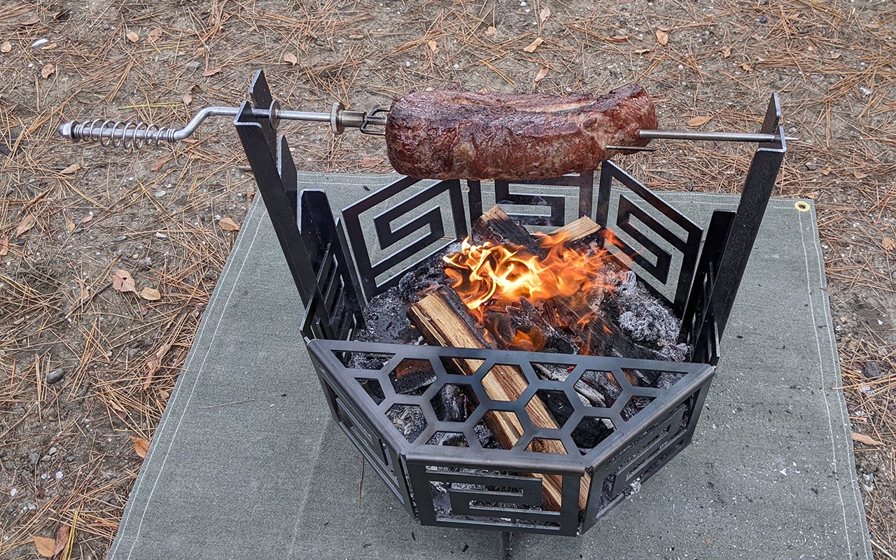 『狩猟型焚火台インフィニティ』は、頑丈な3.2mm厚の黒皮鉄板を使った組立式の焚火台で、キャンプ初心者でも簡単に組み立てることができます。支柱を焚火台本体にセットしてステンレス製の焼串を使用することにより、原始スタイルの豪快で楽しいキャンプ料理体験を提供いたします。また、クラウドファンディング発表時から生産工程とセット内容を見直し、本体、支柱、焼串、五徳、帆布袋の5点セットで88,000円(税込)と、より多くのお客様にご利用いただける価格に設定しました。『狩猟型焚火台インフィニティ』のワイルドで楽しい体験が、あなたのアウトドアライフをより一層豊かにしてくれます。