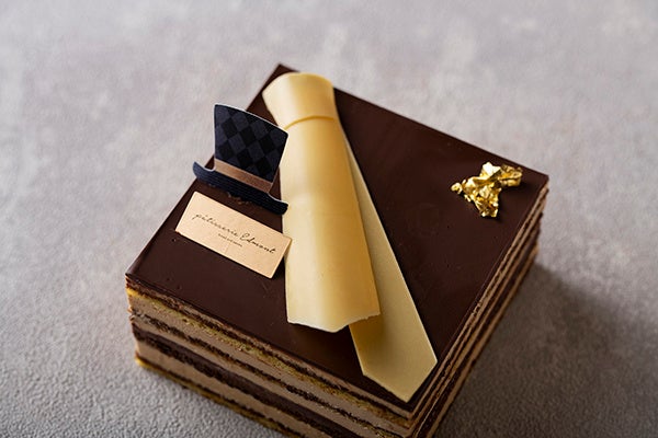 コーヒーを効かせた生地やバタークリーム、ガナッシュを何層にも重ね合わせた濃厚で奥深い味わいのチョコレートケーキ「オペラ」に、チョコレート細工のネクタイをおしゃれに飾りつけ、スーツ姿のお父さんを思わせるユニークなデザインに仕上げました。