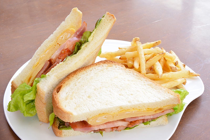 軽く焼いた食パンにベーコン・レタス・トマト・卵焼きをサンド。マイルドなからしマヨネーズで一層おいしさアップ。ポテト付き。