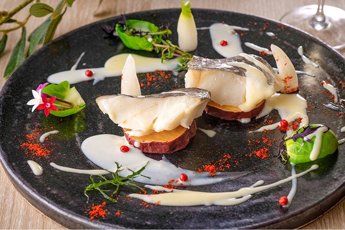 【鯛のヴァブール~軽いブランソース~】。蒸し煮にしたしっとりした鯛の身にあさりベースのクリームソースを添えてご提供いたします。冷たい白ワインがぴったりの美味しさです。