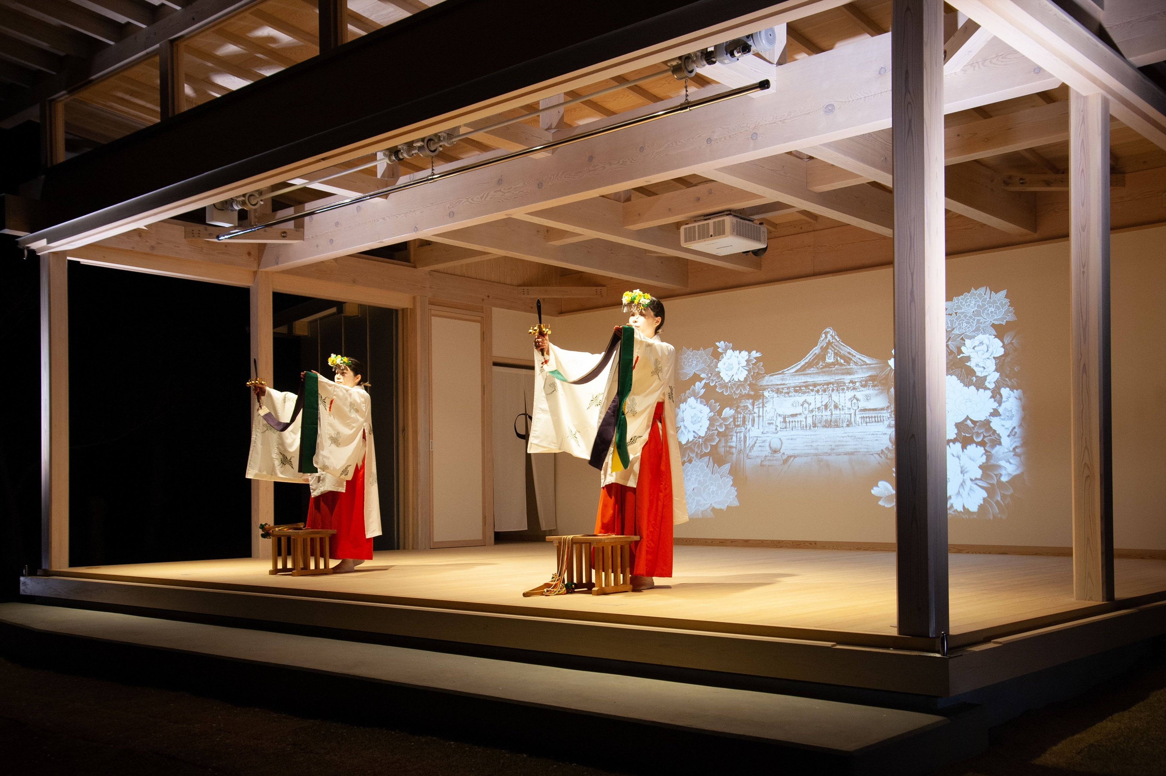 また本年より、花まつりに合わせて牡丹園並びに境内の「宵詣(よいもうで)(夜間ライトアップ」を行います。昨年竣工しました神楽舞台においても 、昼の奉納技芸舞台と合わせ、夜の宵詣舞台も行われます。