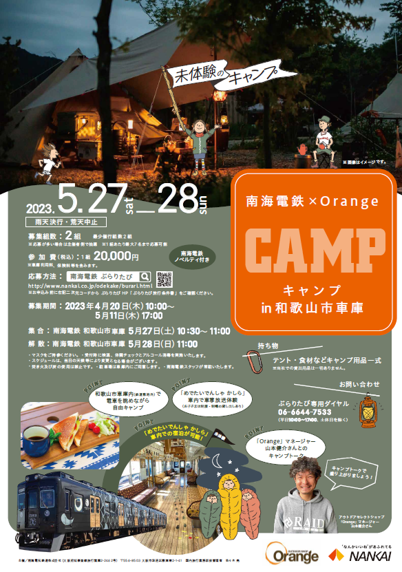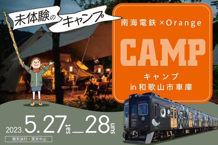 南海電気鉄道株式会社(社長:岡嶋 信行)では、人気アウトドアショップ「Orange」と協力し、和歌山市車庫内での貸し切りキャンプを5月27日(土)~28日(日)に1泊2日で行います。