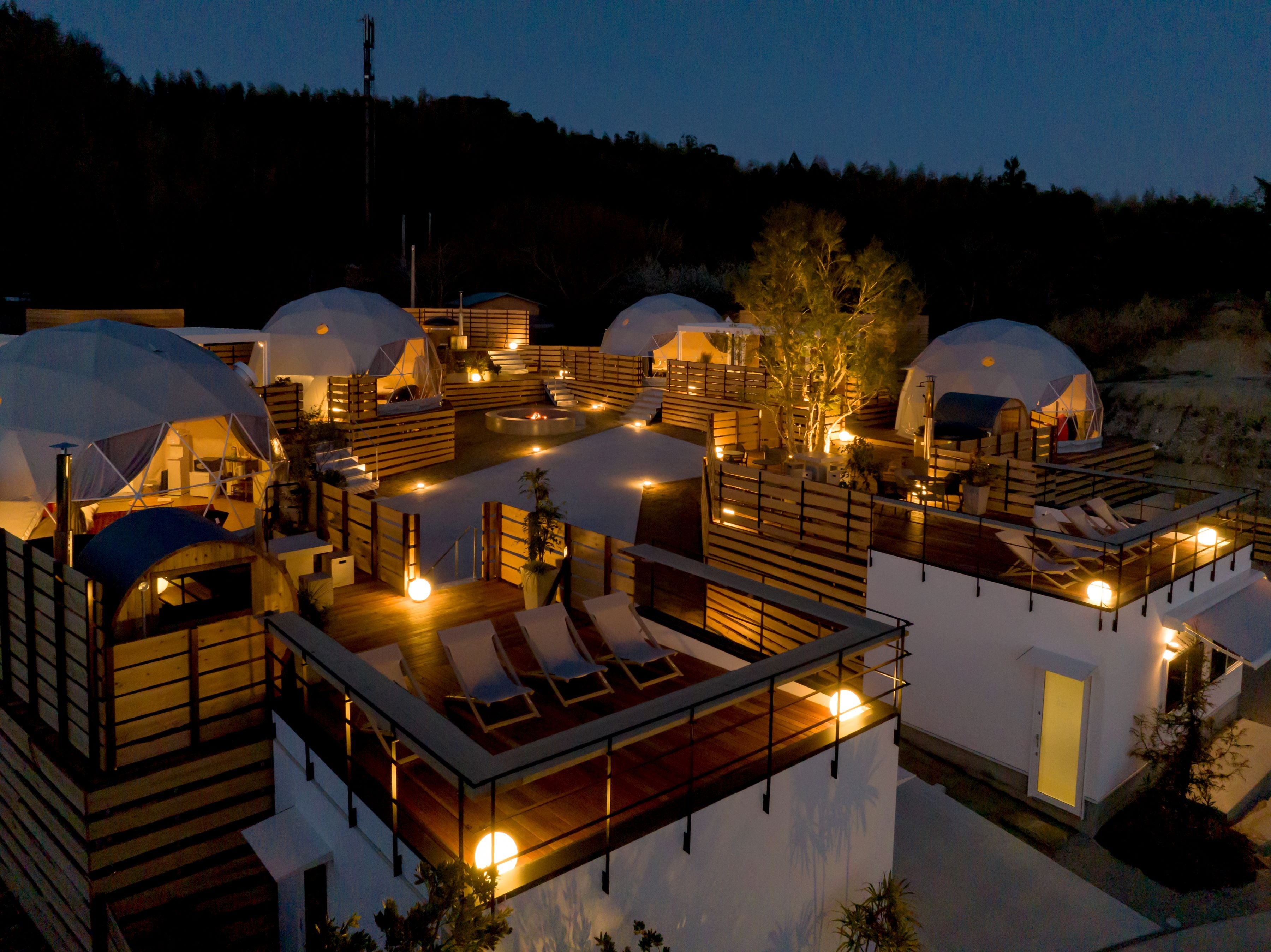 ●ドーム型テント 4 棟 本場フィンランド製のバレルサウナ、ポータブル・ホットタブ (露天風呂)、シャワー、外気浴ソファ、BBQ グリル完備。 ※1 泊 夕・朝食付き 33,000 円~ 〈アメニティも充実!〉 ヴィラ、テントともに水素水を活かしたシャンプー、コンディショナーを はじめ、プロの美容師が使うドライヤーなど 高級ホテル以上のクオリティを持つアメニティを装備しています。