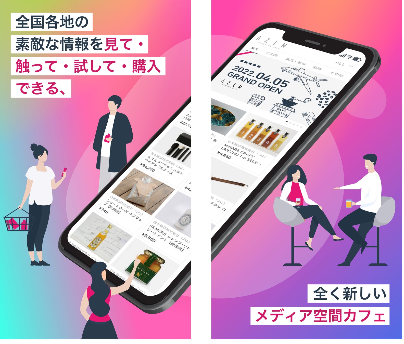 「AZLM」とは、あらゆる商品をライブでマーケティングできる未来型の店舗を意味しています。店舗には約300点の展示スペースに全国の逸品をディスプレイし、見て、触って、試せる、体験できる機会を提供します。