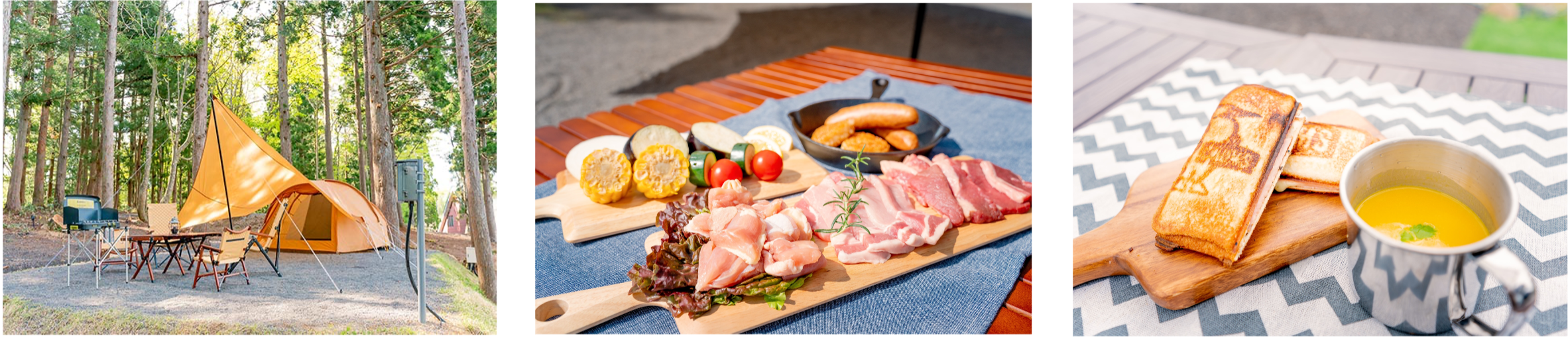 夕食・朝食付の手ぶらプランで何も気にせずキャンプを満喫!テント、タープ、フロアマット、シュラフ(人数分)、テーブル&チェア、ランタン、ハンディライト(人数分)、ガスコンロ(鉄板・ガス)、ホットサンドメーカー、食器類(1名につき1セット)、夕食(スタンダードBBQセット)、朝食(ホットサンド、スープ)付