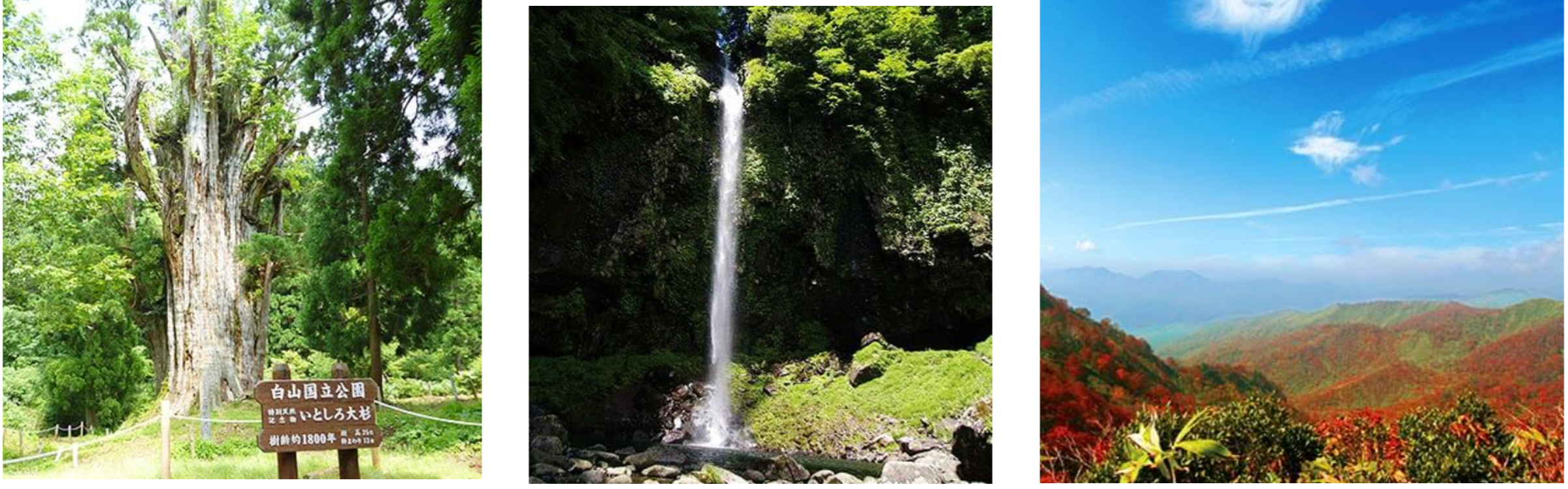 キャンプ場周辺には自然スポットがたくさんあります。清流『石徹白川』をはじめ、大蛇が住むという伝説のある村間ヶ池、推定樹齢は1,800年の特別天然記念物(国指定)の石徹白大杉、白山中居神社の巨木の森、落差60m日本の滝百選の阿弥陀ヶ滝、標高1,709m大日ヶ岳など、全て回るには、1日では足りないほど。