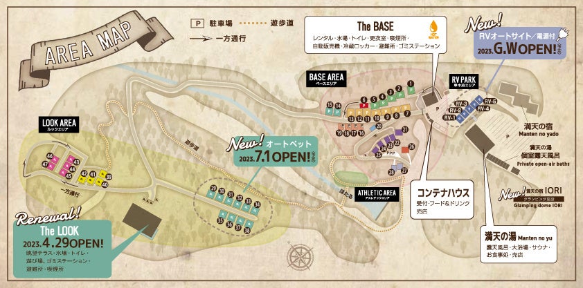 今年の7月頃には、眺望の良いLOOKエリアにも新たに10サイトをOPEN予定!また、キャンピングカーを停車できるRVパークエリアや森の中でお子様が遊べるアスレチックエリアも新設!ターザンロープやトランポリンなどの遊具もあり、ファミリーにおすすめ。日帰りでの利用も可能です。