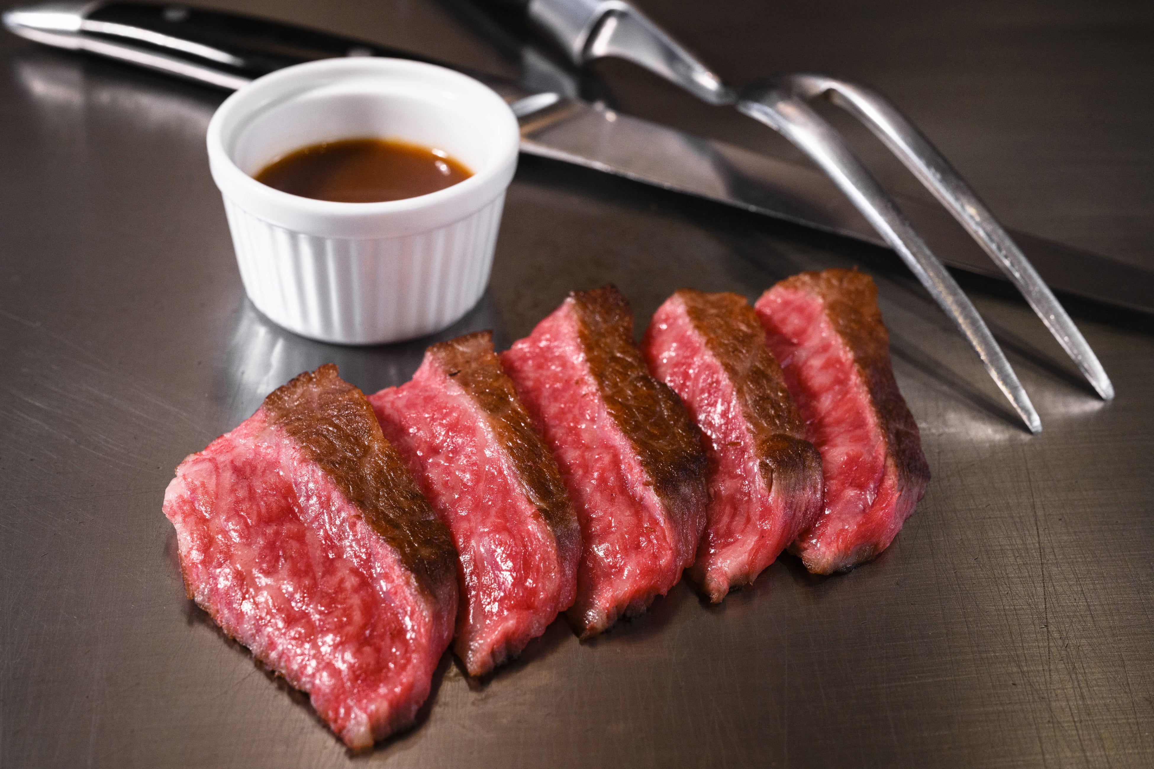 職人の技術を目の当たりにできるカウンター席で、競りから厳選した最高位A5黒毛和牛をお好きなだけお召し上がりいただけます。それぞれのお客様に合わせた気配りやおもてなしを忘れず、居心地の良いお食事のひとときを演出します。