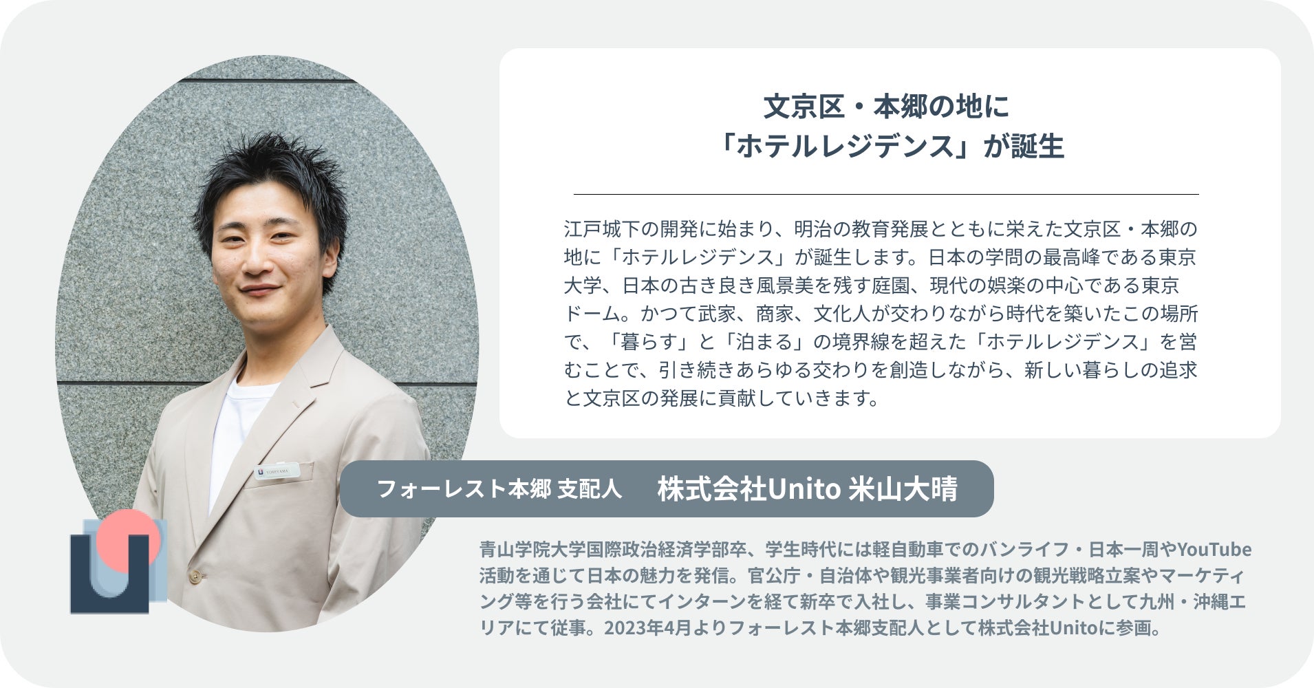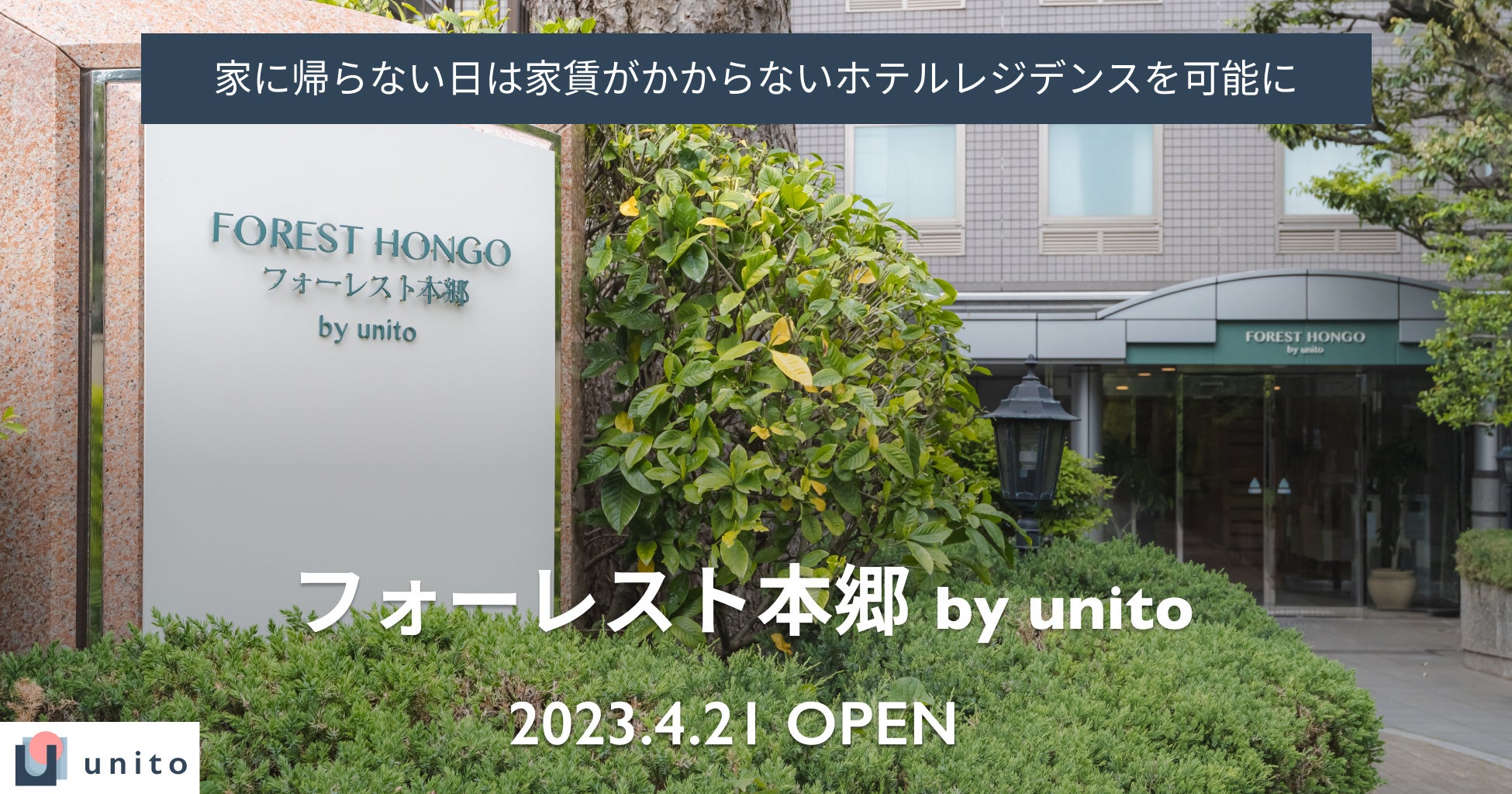 家具・インフラ完備、家賃は住んだ日数分だけのホテルレジデンス「unito」を運営する株式会社Unito(本社:東京都千代田区、代表取締役:近藤佑太朗、以下「ユニット」)は、2023年4月21日より、文部科学省共済組合が所有する宿泊所「フォーレスト本郷」をオープンします。