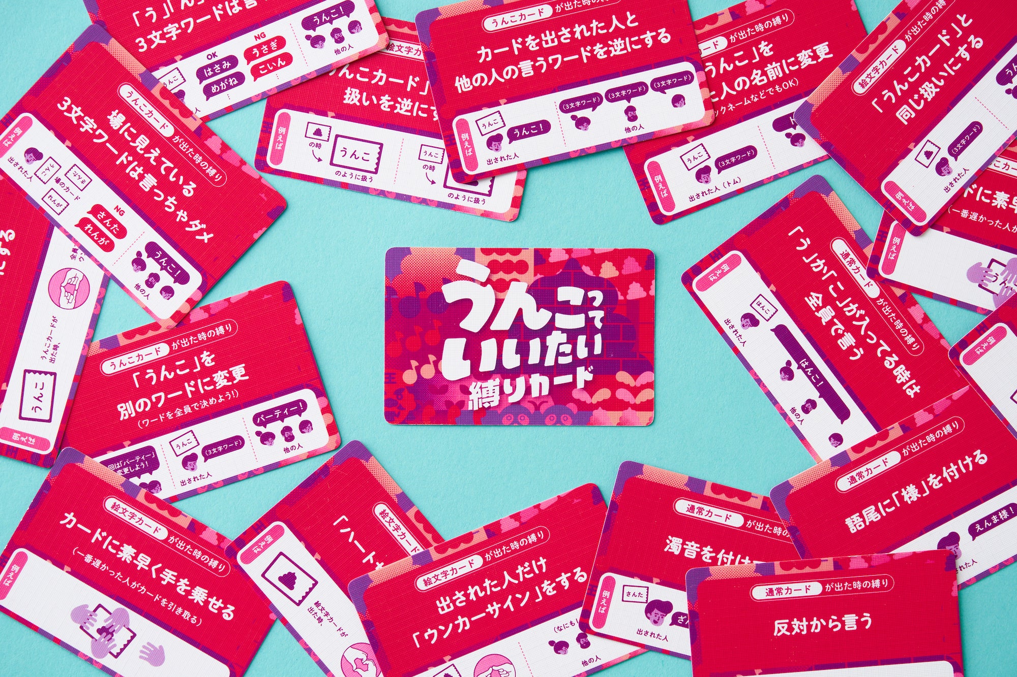 山札から引いたカードを横の人に出し、出された人はカードに書かれた3文字のワードを言います。ただし「うんこ」と書かれたカードが出たら、出された人は別の3文字のワードを言わないといけません。「うんこ」カードを出された人以外は「うんこ」と叫んで、ワードを言うのが一番遅かった人はカードを引き取ります。