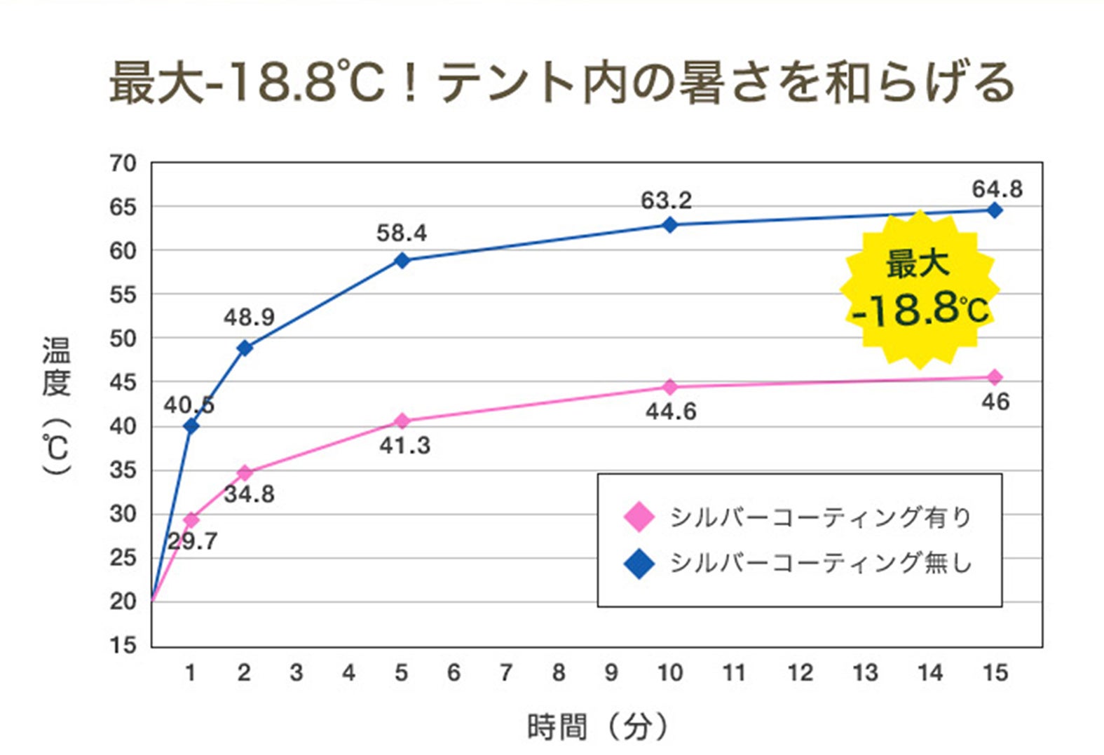 日光を模した光を15分照射した実験では、未加工の生地と比較して最大18.8℃の温度差を確認しており、夏の猛暑においてもテント内の温度上昇を軽減する効果が期待できます。