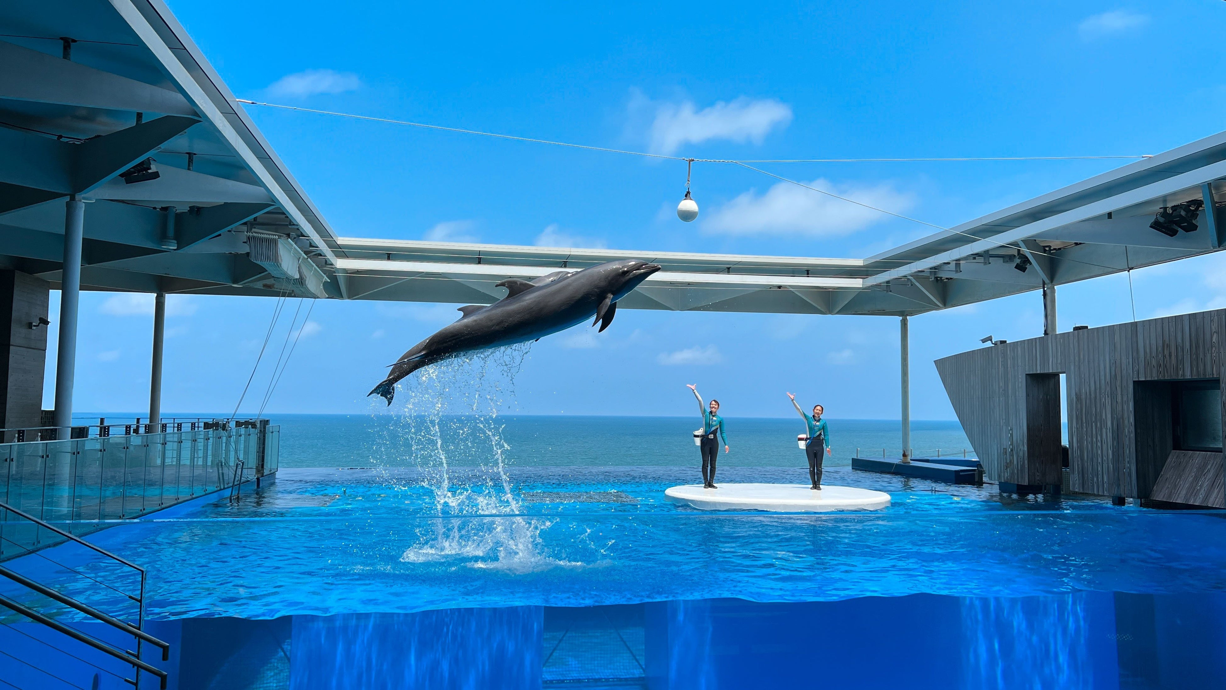 3階イルカスタジアムで行われているドルフィンパフォーマンスは、バンドウイルカ本来の行動や能力の高さを、楽しみながら学んでいただけるプログラムです。日本海をバックにした解放感あふれるロケーションでイルカの様々な能力を感じていただけます。