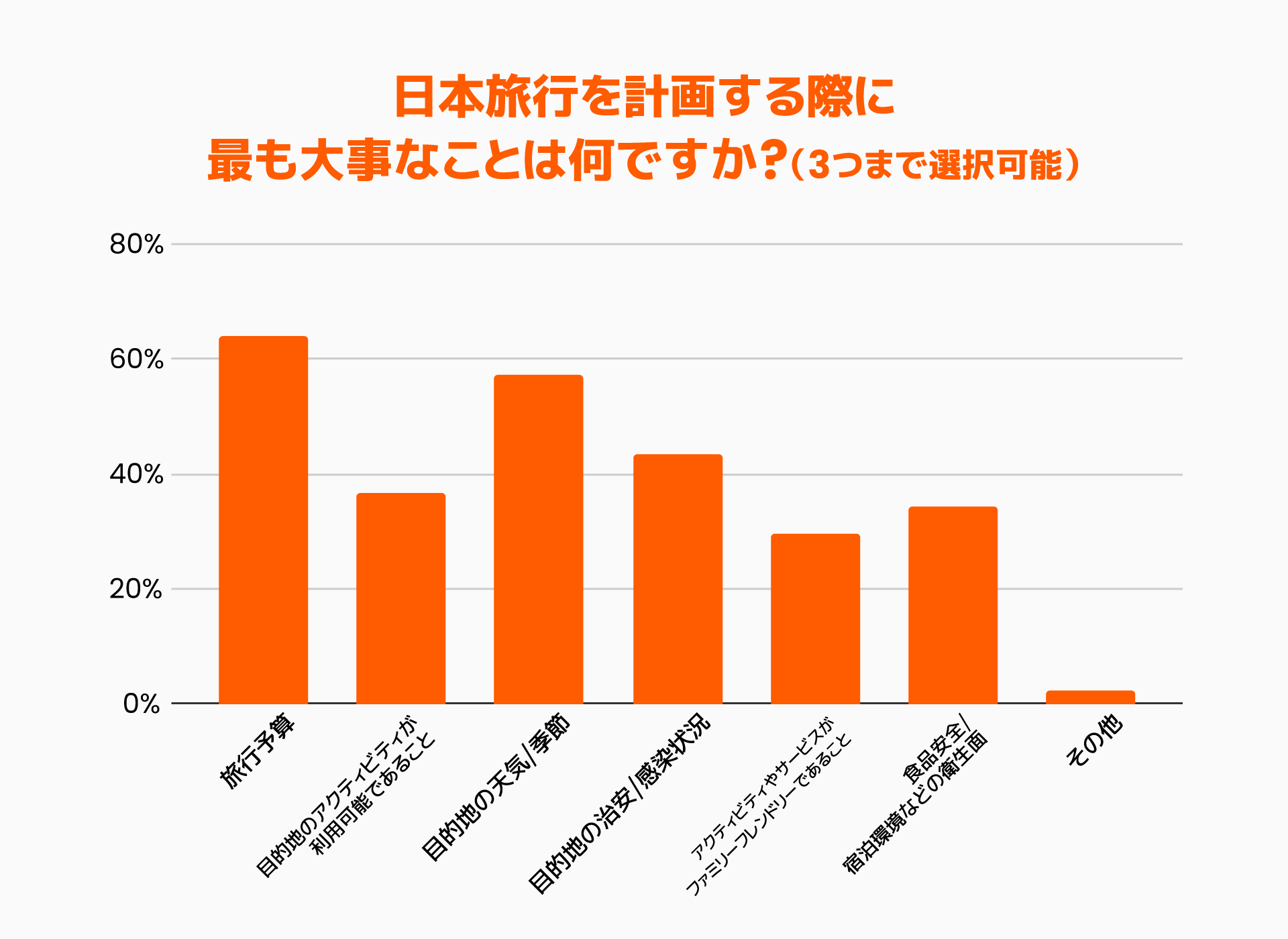 「日本旅行を計画する際に最も大事なことは何ですか?(3つまで選択可能)」と質問したところ、1位は「旅行予算」(64.0%)、2位は「目的地の天気・季節」(57.3%)、3位は「目的地の治安・感染状況」(43.5%)でした。