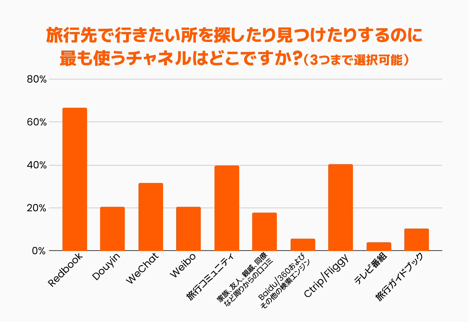 「旅行先で行きたいところを探したり見つけたりするのに最も使うチャネルはどこですか?(3つまで選択可能)」という質問をしたところ(n=628)、1位は「REDBOOK」(66.7%)、2位は「オンライン旅行会社のWebサイト」(40.3%)、3位は「旅行コミュニティサイト」(39.6%)という結果になりました。REDBOOKは中国版Instagramとも言われる写真を中心とするSNSです。4位以降も「WeChat(中国版LINE)」、5位に「Douyin(中国版TikTok)」と続き、中国市場におけるSNSの影響力がうかがい知れる結果となりました。