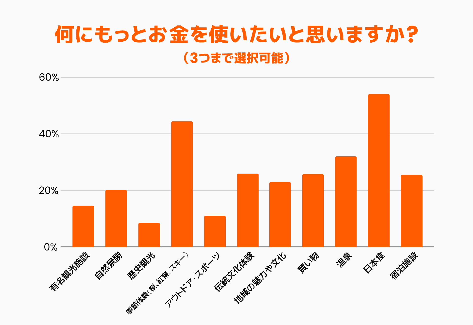 「もっとお金を使いたい」ことの第1位は日本食、2位は季節体験、3位は温泉