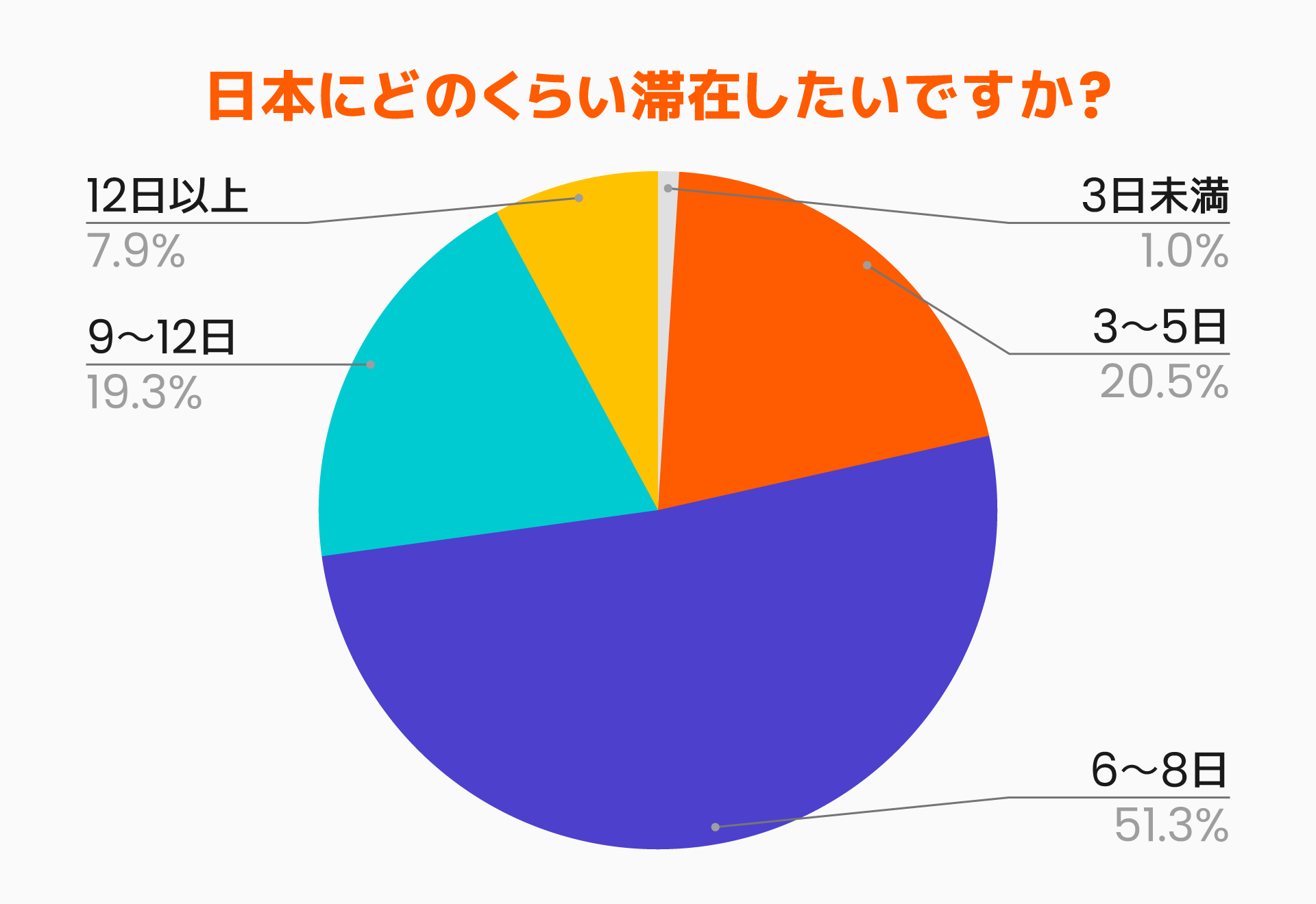 「日本にどのくらいの期間滞在したいですか?」との問いに対し(=508)、「3日未満」との回答が1.0%、「3〜5日」が20.5%、「6〜8日」が51.3%、「9〜12日」が19.3%、「12日以上」が7.9%となり、半数以上が1週間前後の日本滞在を希望している結果となりました。