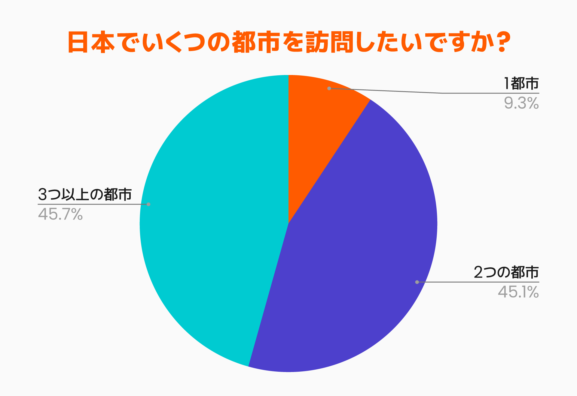 「日本でいくつの都市を訪問したいですか?」と質問したところ(n=508)、3都市以上が45,7%、2都市が45.1%、1都市が9.3%と、合わせて9割以上の人が複数の都市を訪問したいと考えていることがわかりました。