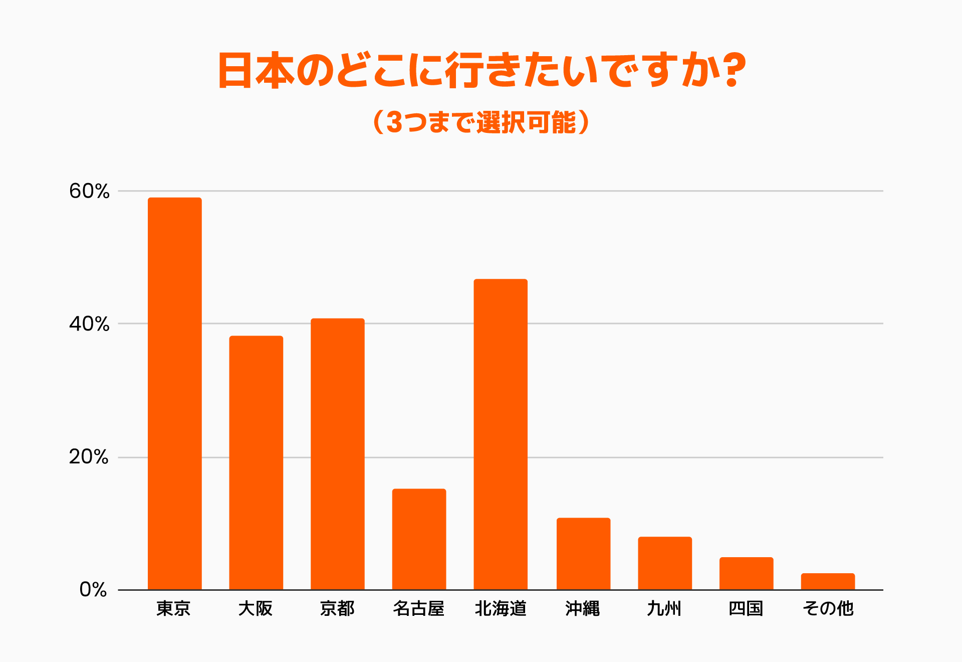 「日本のどこに行きたいですか?(3つまで選択可能)」と質問したところ(n=508)、1位は東京(59.1%)、2位は北海道(46.7%)、3位は京都(40.9%)、4位は大阪(38.2%)という結果となりました。名古屋と沖縄が5位、6位と続きました。